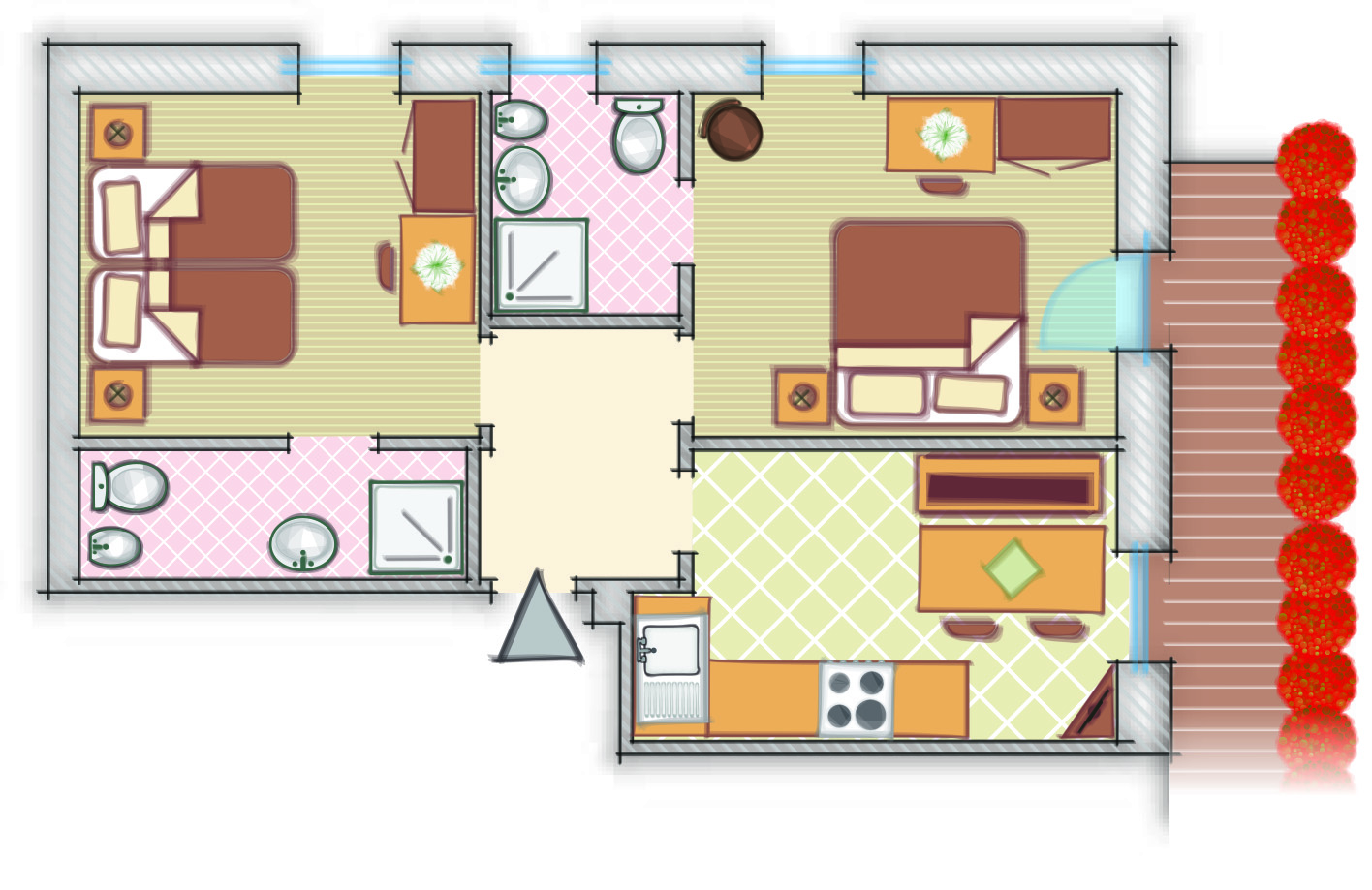 Квартира № 8. Это двухкомнатные аппартаменты, рассчитанные на семью или компанию до пяти человек. Одна из комнат меблирована двумя односпальными кроватями, другая – двуспальной. К ней мы можем добавить детскую кроватку или еще одно спальное место для взрослого.