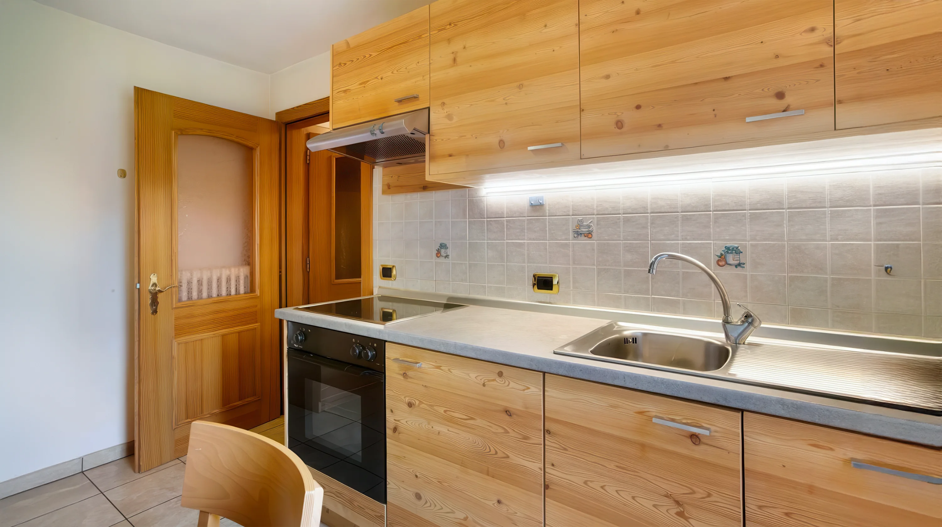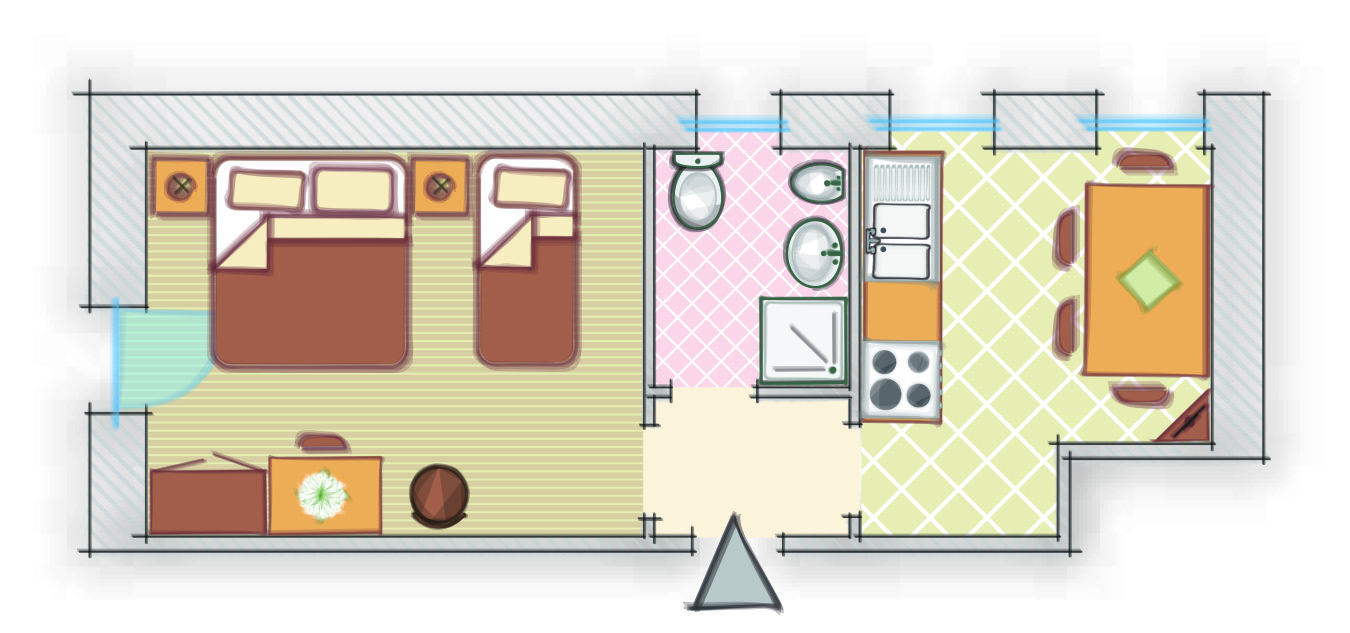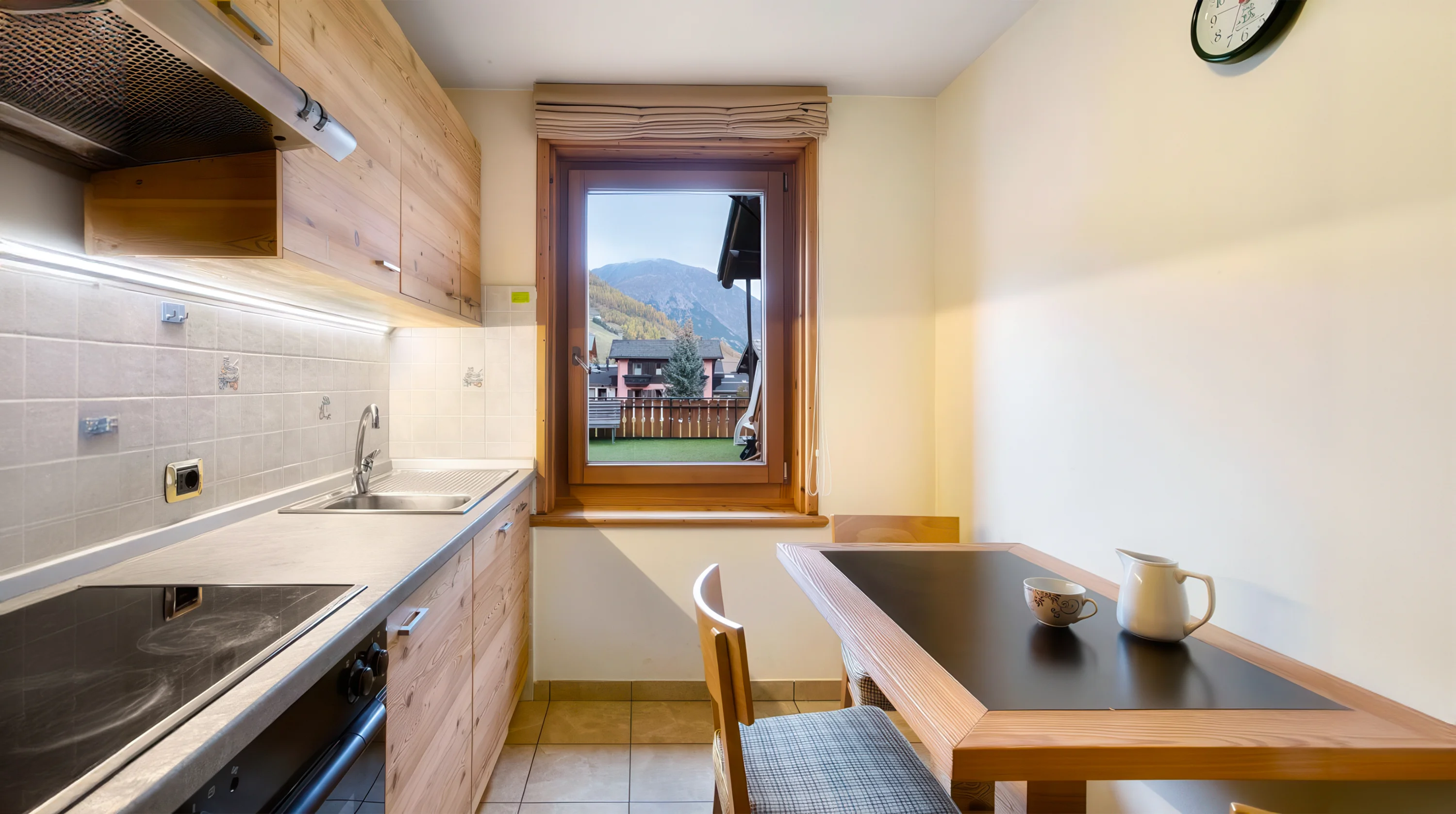 L'area giorno/cucina è completamente attrezzata con lavastoviglie, piano cottura in vetroceramica, forno, stoviglie e TV satellitare con canali internazionali.
