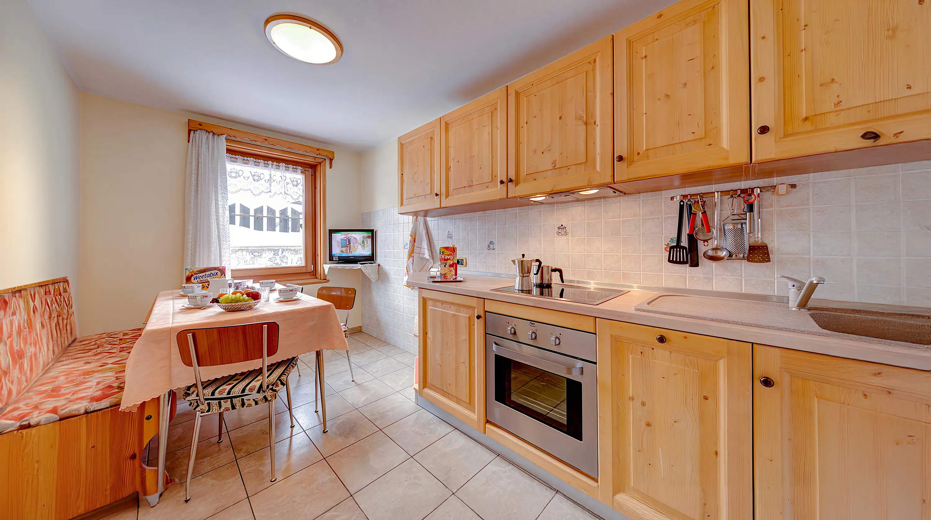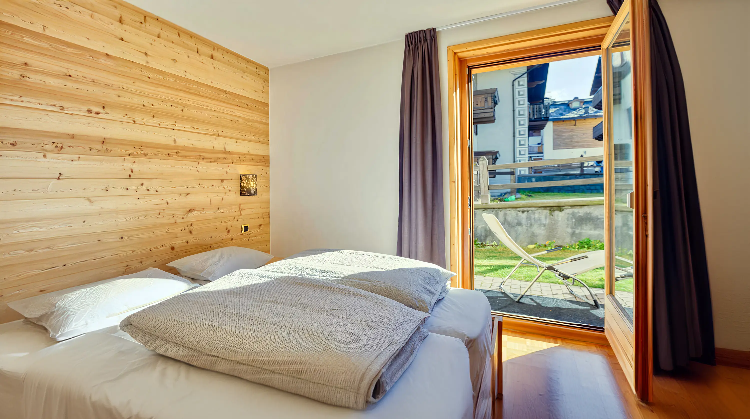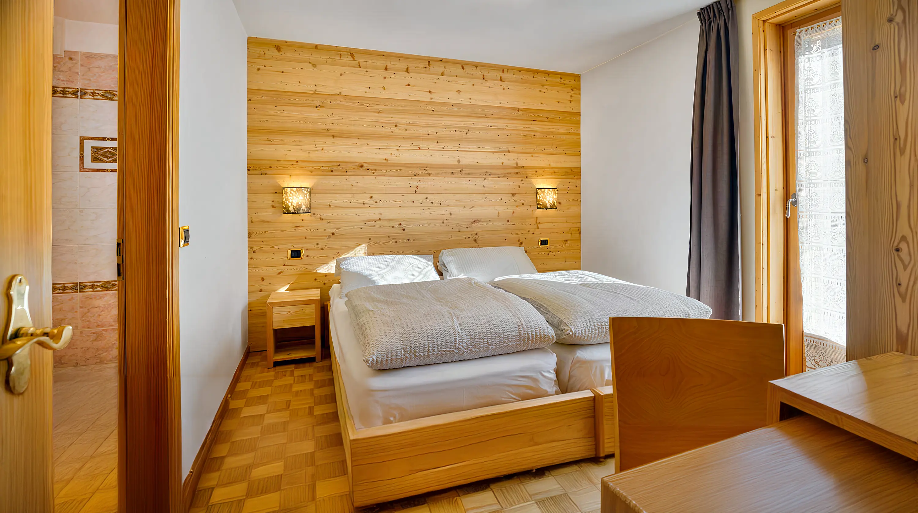 L'Appartamento Legno, situato al piano terra, può ospitare fino a quattro persone e una culla, dispone di due camera da letto, le quali possono essere matrimoniale o due letti singoli. Ogni camera è dotata di un bagno privato con doccia cromo terapia. L’appartamento è stato recentemente oggetto di nuovo restyling Inoltre, l'appartamento offre un’area esterna privata con vista montagna.