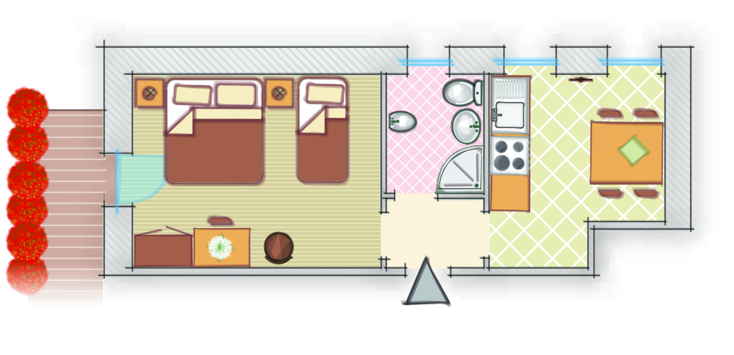L'area giorno/cucina è completamente attrezzata con lavastoviglie, piano cottura in vetroceramica, forno, stoviglie e TV satellitare con canali internazionali.