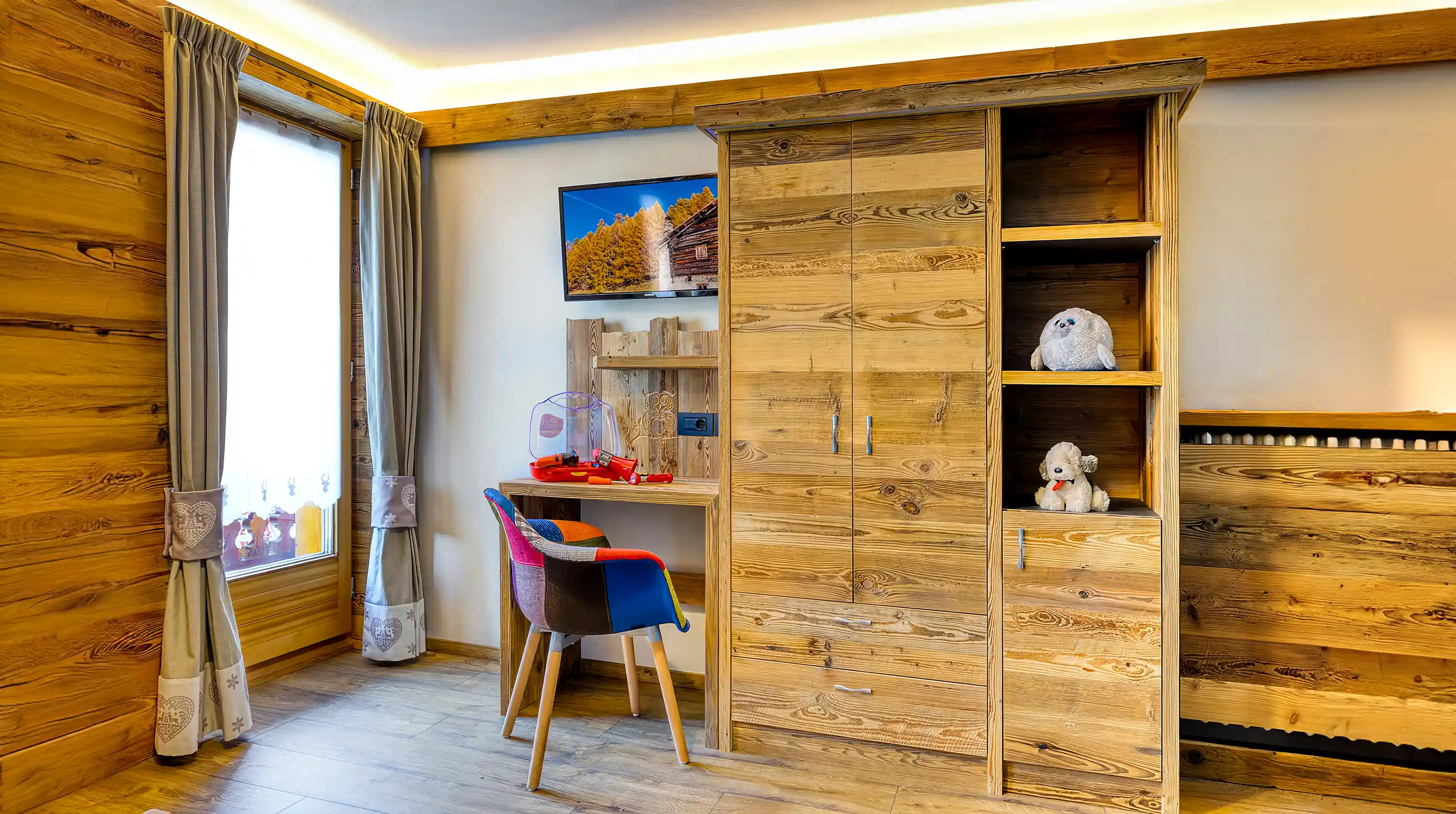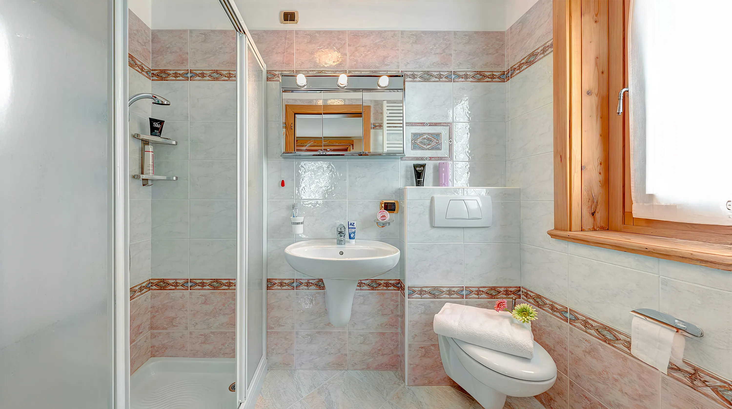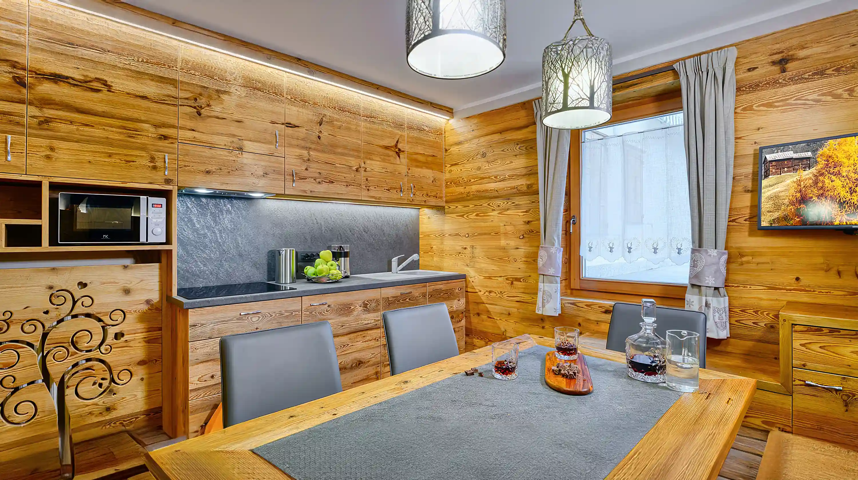 L'Appartamento Tea, situato al piano terra, può ospitare fino a sei persone e una culla, dispone di tre camera da letto, le quali possono essere matrimoniale o due letti singoli. Ogni camera è dotata di un bagno privato con doccia cromo terapia. L’appartamento è stato recentemente oggetto di nuovo restyling Inoltre, l'appartamento offre un terrazzo esterno privato con vista montagna.